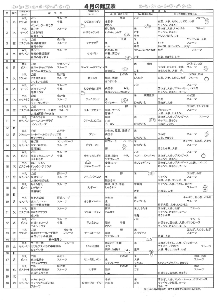 令和8年度(2026年度)4月の給食メニュー 2026 3/27 給食 2026年4月1日 ダウンロード 給食 よかったらシェアしてね! URLをコピーしました! URLをコピーしました! 園見学&入園説明会について 令和8年度 ぴょんぴょんルームのお知らせ 関連記事 令和7年度(2025年度)3月の給食メニュー 2026年3月1日 令和7年度(2025年度)2月の給食メニュー 2026年2月1日 令和7年度(2025年度)1月の給食メニュー 2026年1月1日